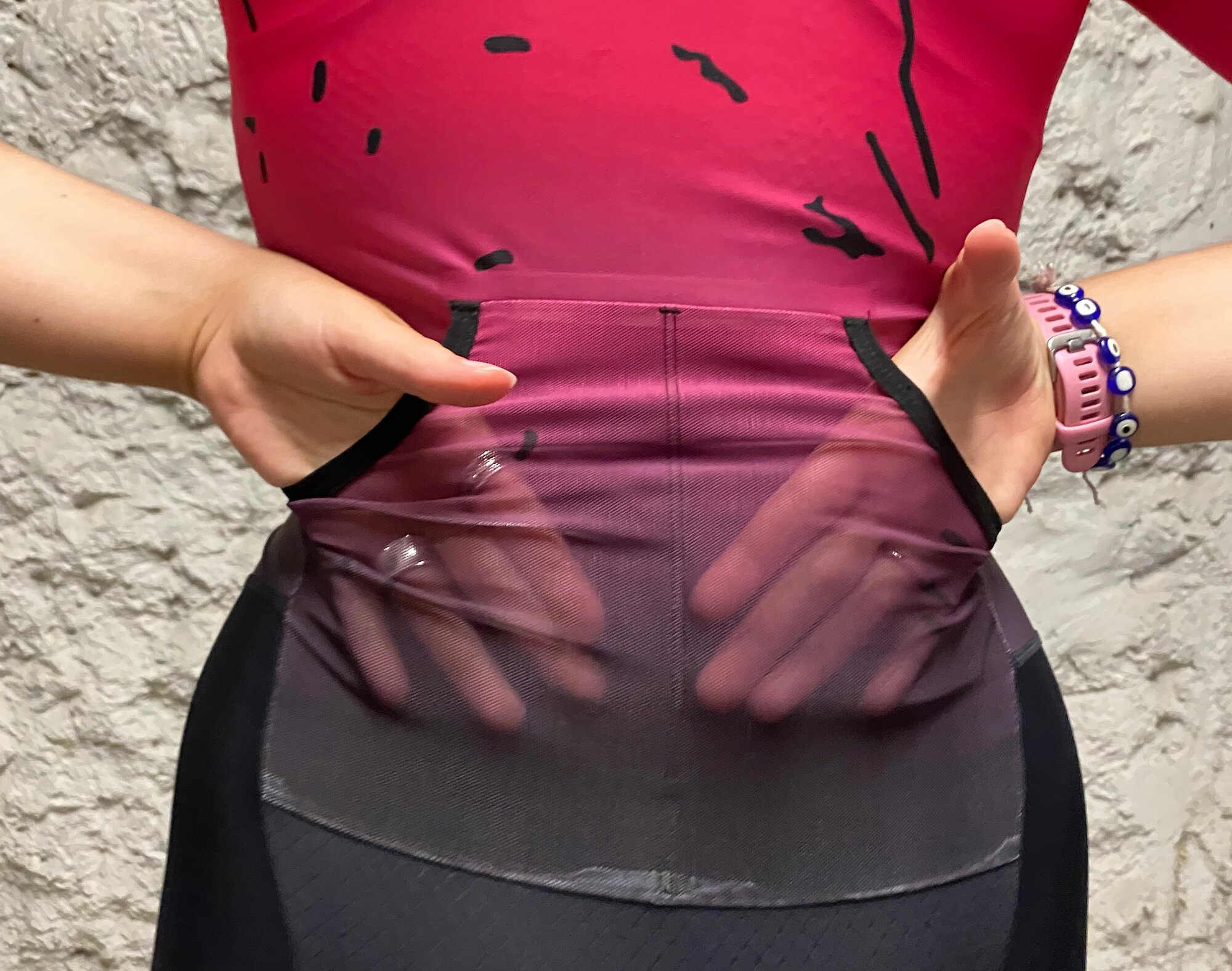 - Zadné vrecko – priestranné a ľahko dostupné; ideálne na gély či softflask. Je rozdelené prešitím na polovicu, takže si môžete pohodlne rozdeliť výživu a nemusíte hľadať po chrbte práve ten gél, ktorý potrebujete.