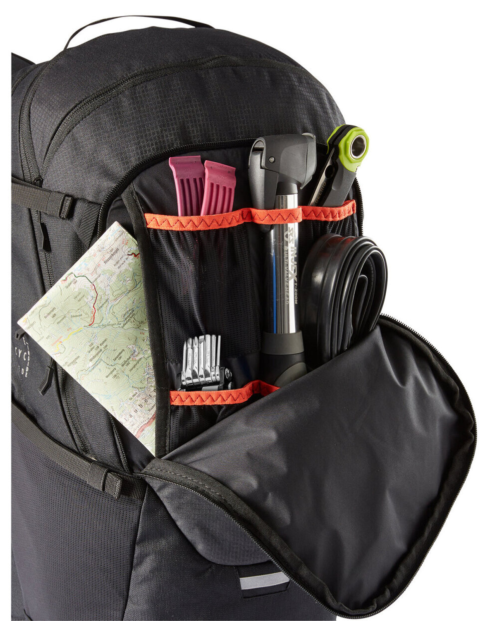 - batoh je rozdelený na tri priehradky. Veľká hlavná priehradka sa dá rozdeliť pre lepšiu organizáciu oblečenia a jedla a ponúka samostatný prístup zhora alebo zdola, pred ním je ďalšia priehradka na okuliare alebo peňaženku, priehradka na náradie v prednej časti, pod ním je miesto pre mapy alebo iné dokumenty, má tiež skrytú priehradku s držiakom na prilbu