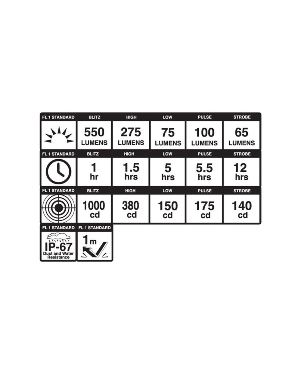REŽIMY Blitz 550 lumenov/1 h, High 275 lumenov/1,5 h, Low 75 lumenov/5,5 h, Pulse 100 lumenov/5,5 h, Strobe 65 lumenov/12 h