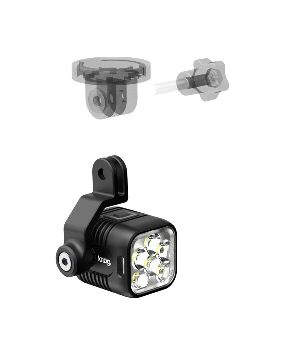 Knog Blinder E-X GoPro Mount je kompaktný držiak určený na montáž predného svetla série Knog Blinder E alebo Blinder X. Umožňuje pripevniť svetlo priamo pod držiak cyklopočítača alebo navigácie, vďaka čomu vytvára čistý a usporiadaný vzhľad kokpitu bicykla.