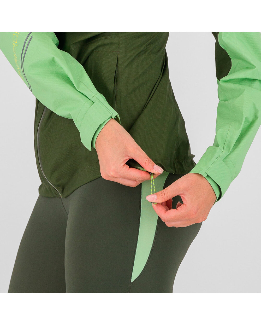 Sťahujúca šnúrka v páse umožňuje individuálne prispôsobenie bundy a zabraňuje prenikaniu vetra dovnútra.