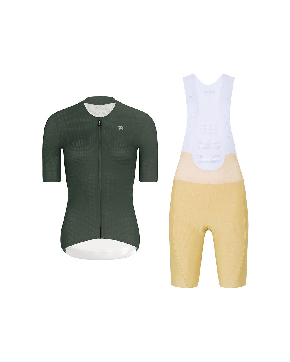 Rivanelle set pre cyklistky – ELEVATE zelený dres + NOVEL PRO béžové nohavice s trakmi